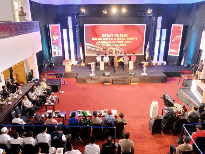 GLOBALNEWS21.ID,Pidie Jaya/Aceh – Komisi Independen Pemilihan ( KIP ) kabupaten Pidie Jaya melaksakanakan Debat Publik bagi pasangan calon Bupati dan Wakil Bupati Pemilihan 2024 di gedung DPRK yang ditayang lansung oleh Kompas TV Aceh dan Inews TV Aceh yang dimulai dari pukul 09.00 WIB sampai 12.00 WIB. Komplek Perkantoran Cot Trieng, Meureudu, 16/11/2024