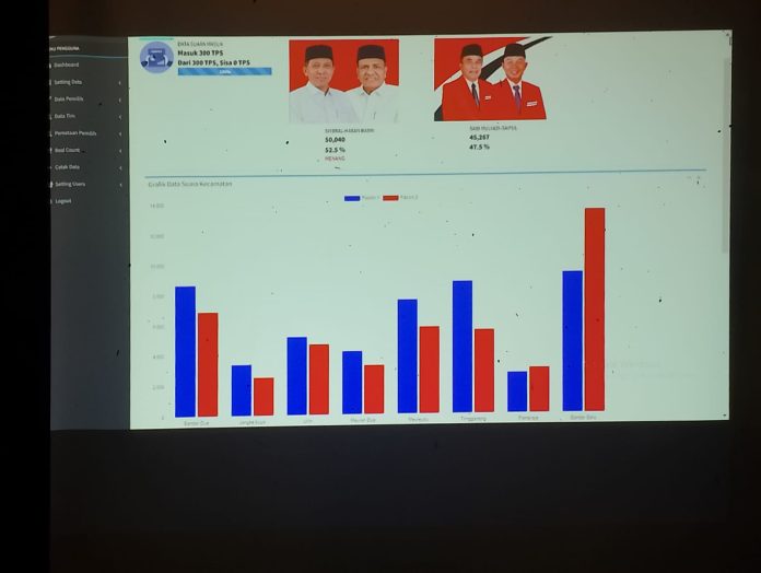 Menurut data yang dihimpun dari posko pemenangan Paslon 01, total suara yang telah masuk mencapai 83 persen dari seluruh TPS. Berdasarkan hasil quick count tersebut, Paslon 01 memperoleh 54 persen suara dengan total 42.400 suara, sementara Paslon 02 mendapatkan 46 persen suara atau setara dengan 36.185 suara.