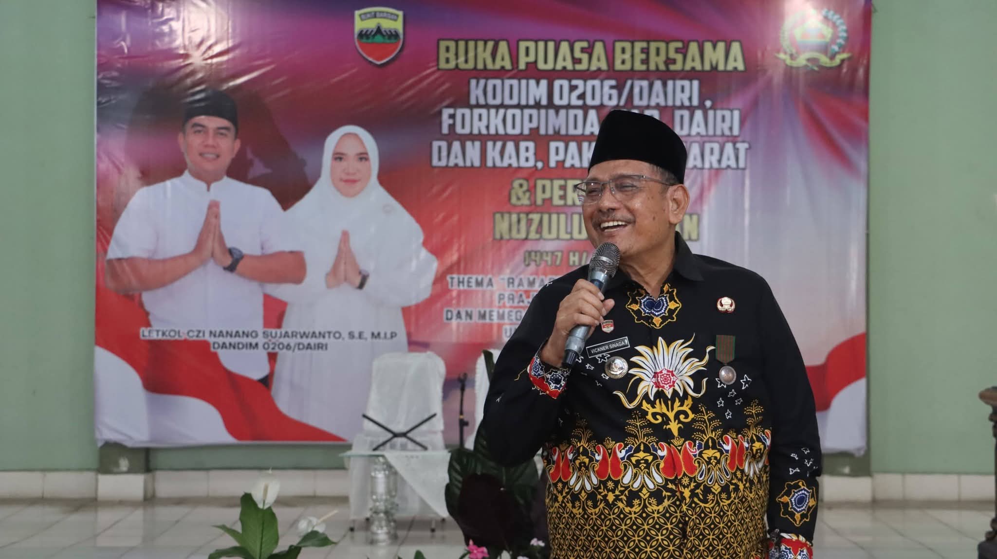 “Momentum Bulan Ramadan ini menjadi Kesempatan yang Baik untuk Mempererat Tali Silaturahmi antara Pemerintah Daerah, TNI, dan Masyarakat. Kebersamaan seperti ini diharapkan semakin Memperkuat Kolaborasi Kita dalam Membangun Kabupaten Dairi. Ditengah Tsunami Anggaran, Gotong-Royong dan Kerjasama dengan bebagai pihak terus Kita Galakkan. Sebagian Pemotongan Anggaran sudah dikembalikan. Kita terus bangun kolaborasi dengan berbagai pihak, baik Vertikal, seperti sehingga Pembangunan seperti Sekolah Rakyat, Bantuan Dibidang Pertanian dan Kesehatan bisa terus ada. Siapa saja yang bisa Kita Gandeng termasuk Swasta. Ini Jalan Pintas ketika Ruang Gerak Fiskal Kita Dibatasi. Marilah Berlomba-lomba Melakukan Kebaikan”, ujar Bupati Dairi, Ir. Vickner Sinaga, M.M.