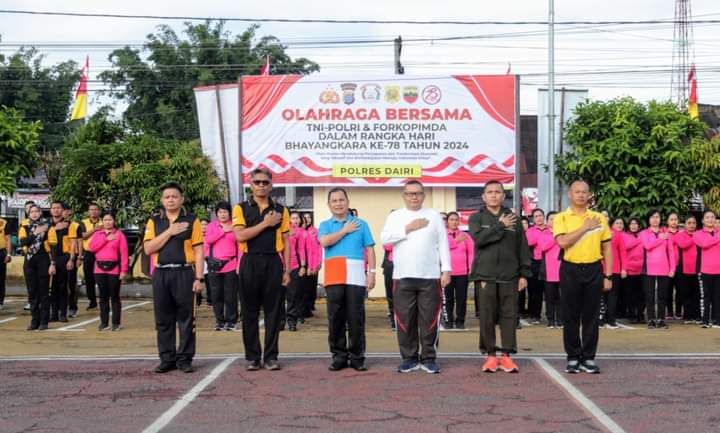 Olahraga bersama yang diadakan oleh Polres Dairi yakni jalan santai dan senam bersama diikuti oleh Pj Bupati Dairi, Charles Bantjin, Kapolres Dairi AKBP Agus Bahari, P.A, SIK, SH, M.Si, Dandim 0206/Dairi Letkol Inf Goklas Pirtahan Silaban serta Kepala Kejaksaan Negeri Dairi Okto Ricardo.