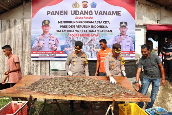 GLOBALNEWS21.ID,Pidie Jaya — Dalam rangka mendukung Program Asta Cita Presiden RI di bidang ketahanan pangan, Kapolres Pidie Jaya, AKBP Ahmad Faisal Pasaribu, SH., S.I.K., MH., bersama Pejabat Utama (PJU) Polres Pidie Jaya, melaksanakan panen udang vanamei pada Jumat, 15 November 2024.